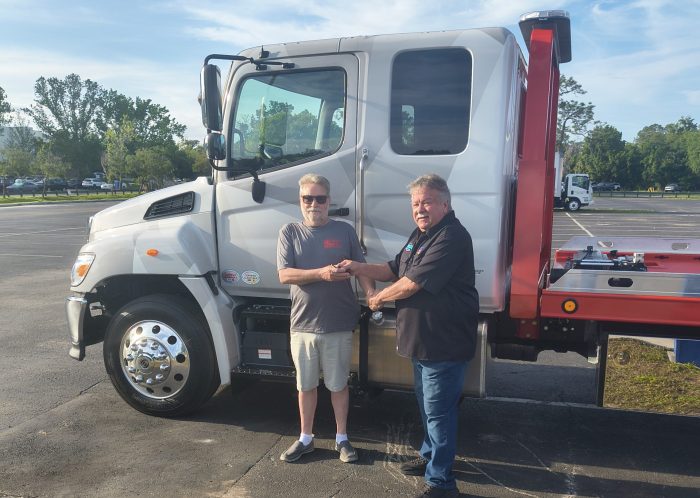 Jon Redman, left, of Northern Neck Auto Parts (King George, VA) and Redman Fleet Services (Alexandria, VA) accepts the keys for the 2026 PWOF raffle truck from PWOF Board Member Frank Ennis. Redman held the winning ticket for the 2026 Hino L6 extended cab equipped with a Miller Industries flatbed. The drawing was held Saturday, April 11 at the Florida Tow Show®.
